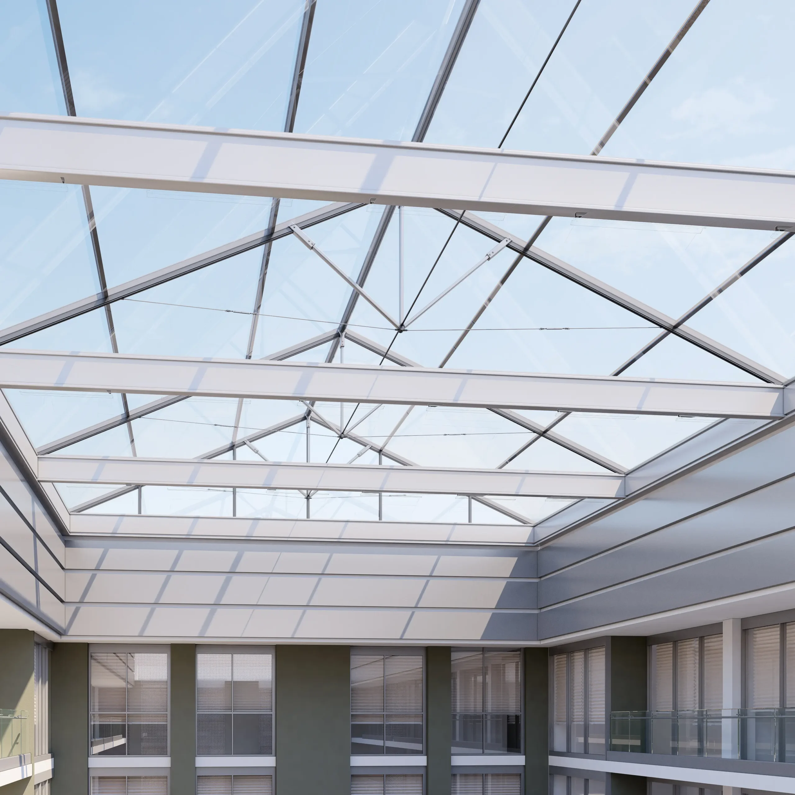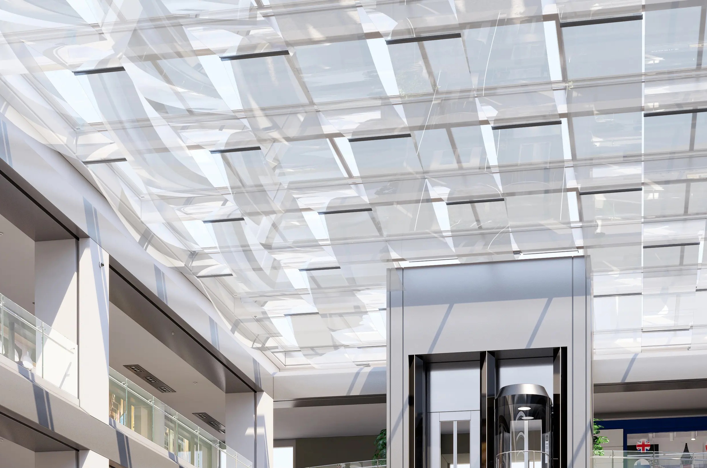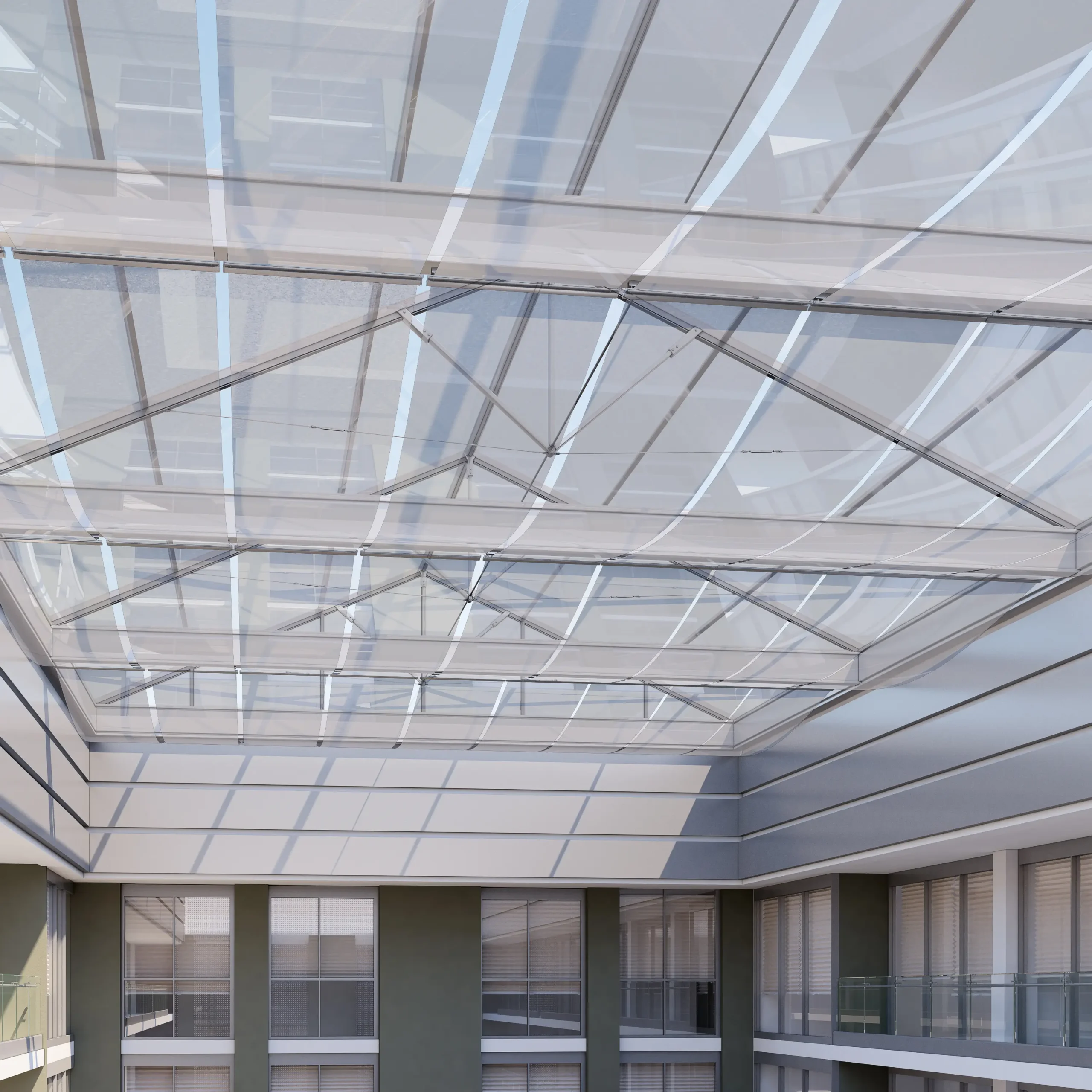 Clearsorber® SLACK is mounted overhead and below the glazed ceiling in either single or dual layers. The foils are supported at each end with hem bars that are spring-supported from the structure above. The foils hang slack between the hem bars for a draping effect. The depth of the draping effect can be customized for each project based on project requirements.